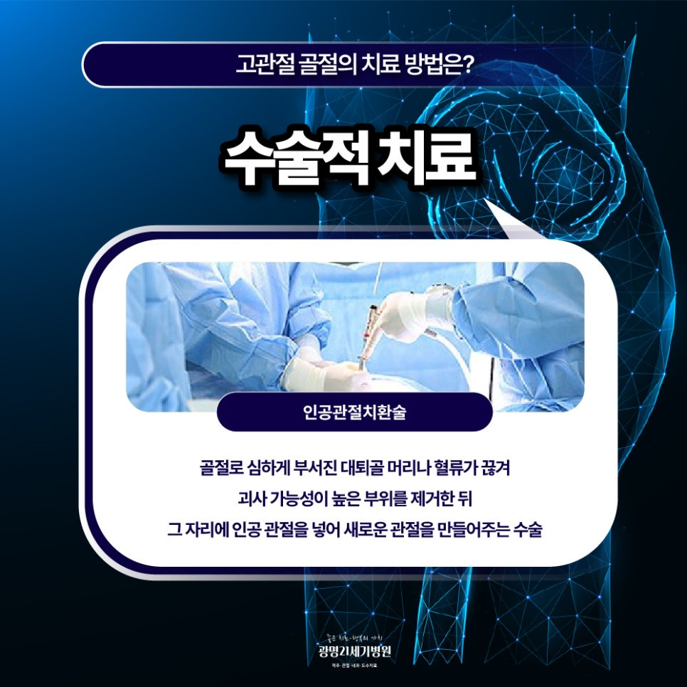 그러나 보통 고관절 골절은 수술적 치료가 필요한 경우가 더 많습니다. 어긋남이 있거나 형태가 불안정한 경우 고령이거나 골다공증이 동반된 경우에는 수술을 통해 회복을 앞당기는 방향을 선택할 수 있습니다.