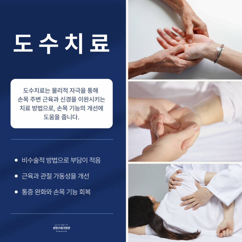 통증이 심하지 않은 범위에서 진행되며 회복 과정에서 부담이 비교적 적은 편입니다. 약물이나 주사 치료가 부담스러운 경우에도 병행하여 고려할 수 있죠. 무엇보다 손목과 손가락 기능을 회복하는 것에 초점을 두어 재발 위험을 낮추는 관리로 이어질 수 있다는 장점이 있습니다.