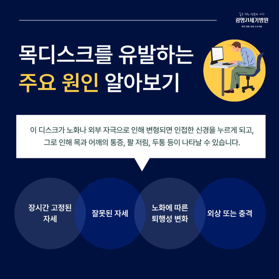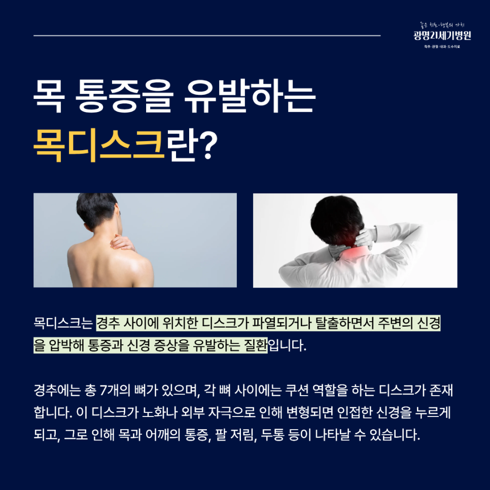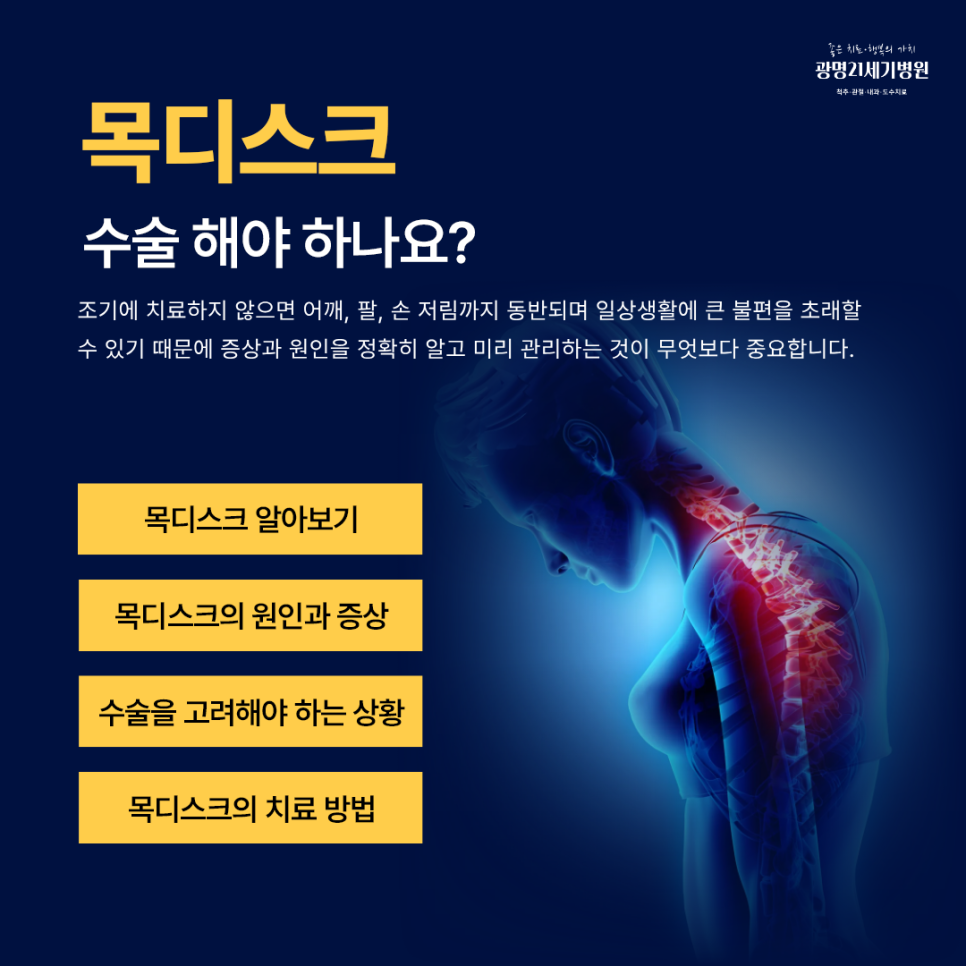오늘은 철산동 인근에 위치해 척추 질환 진료를 보는 광명21세기병원에서 목디스크에 대해 알아보고 수술을 고려해봐야 하는 상황까지 알아보도록 하겠습니다.