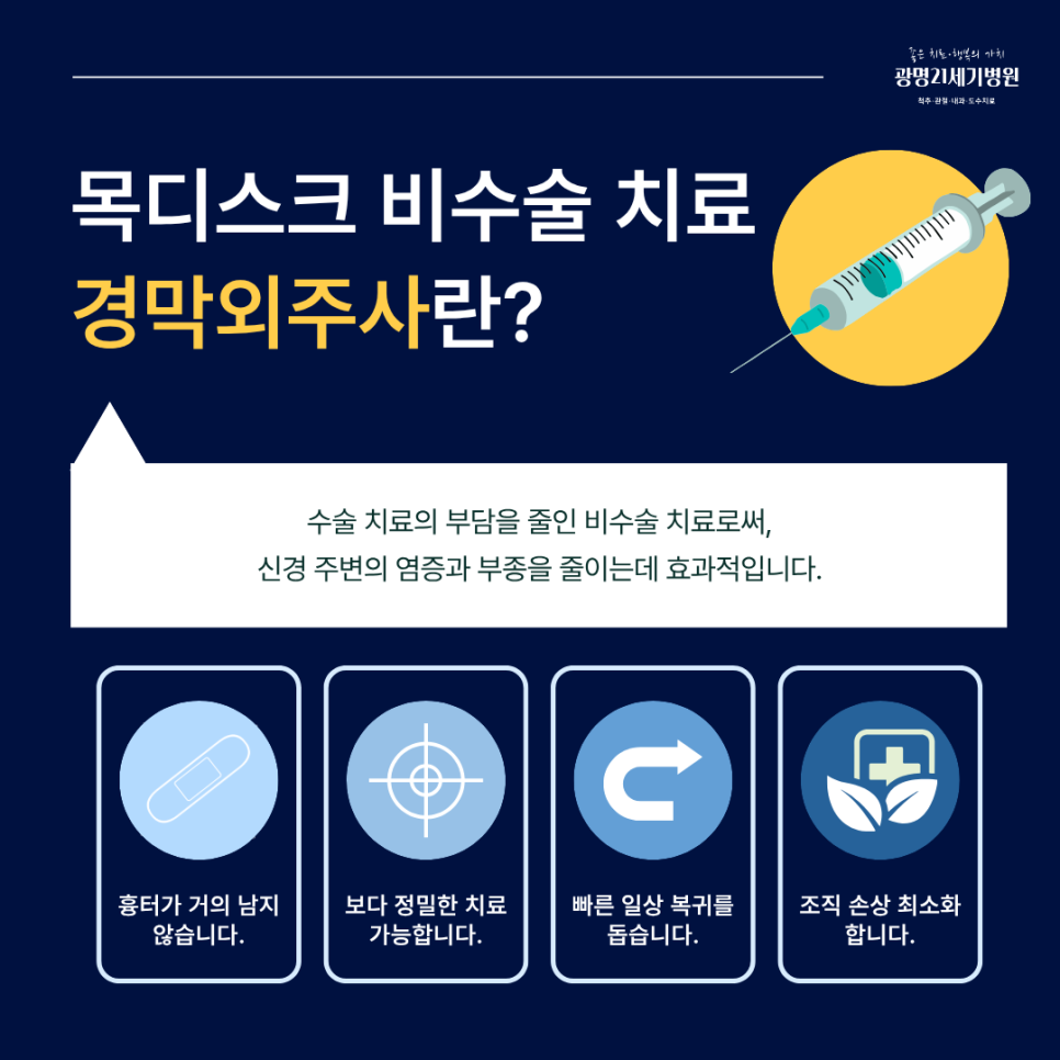 신경의 염증을 직접적으로 줄여 증상의 개선을 기대할 수 있으며 일상으로의 복귀가 비교적 빠릅니다. 또한 비수술적 치료 방법이기 때문에 수술을 고려하기 전에 시도해볼 수 있는 치료이죠.